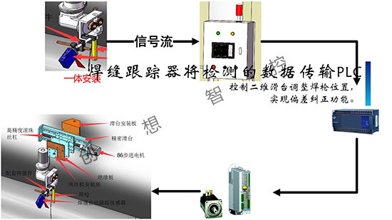 焊縫跟蹤器將檢測的數(shù)據(jù)傳輸PLC,控制二維滑臺調(diào)整焊槍位置,實現(xiàn)偏差糾正功能。