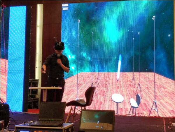 在發(fā)布會現(xiàn)場,創(chuàng)想智控CEO張煒林體驗(yàn)了這套設(shè)備,一個(gè)是演示者第一人稱視角看到的虛擬世界,一個(gè)是舞臺下觀眾視角看到的虛擬世界。虛擬世界中的環(huán)境幾乎與舞臺完全一樣,攝像頭、交互手柄、椅子、桌子等一些物品,這些物品在現(xiàn)實(shí)當(dāng)中可以看到,在虛擬世界里面也可以看到。演示者演示了精準(zhǔn)的位置追蹤,可以準(zhǔn)確的拿到這些物品,并且通過挪動椅子、桌子、揮舞放置拾取手柄來進(jìn)行交互,基本上做到了現(xiàn)實(shí)世界與虛擬世界的重合。據(jù)介紹現(xiàn)場的空間只有部分舞臺大小的這個(gè)環(huán)境,僅僅是利用幾個(gè)小時(shí)的時(shí)間臨時(shí)搭建起來的商用虛擬現(xiàn)實(shí)環(huán)境,場地面積可以支持到數(shù)百平米至數(shù)千平米,而且在這樣的環(huán)境中可以追蹤多個(gè)人和物體。